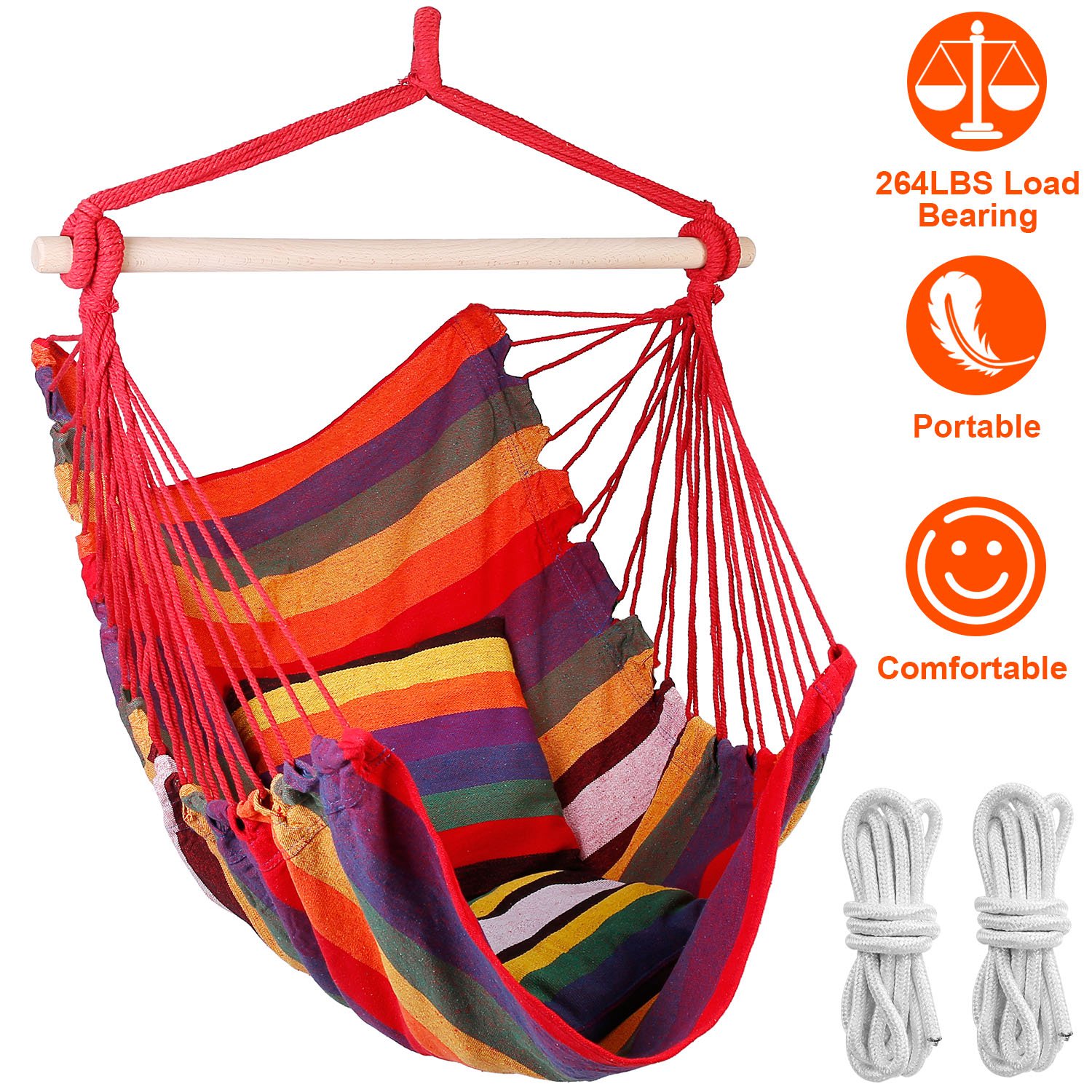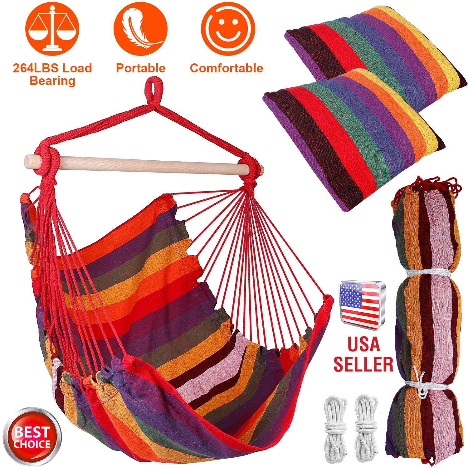 Home > Hammock Hanging Chair Canvas Porch Patio Swing Seat Portable Camping Rope Seat Wooden Stick Hammock Chair with 2 Pillows 265LBS Load-bearing