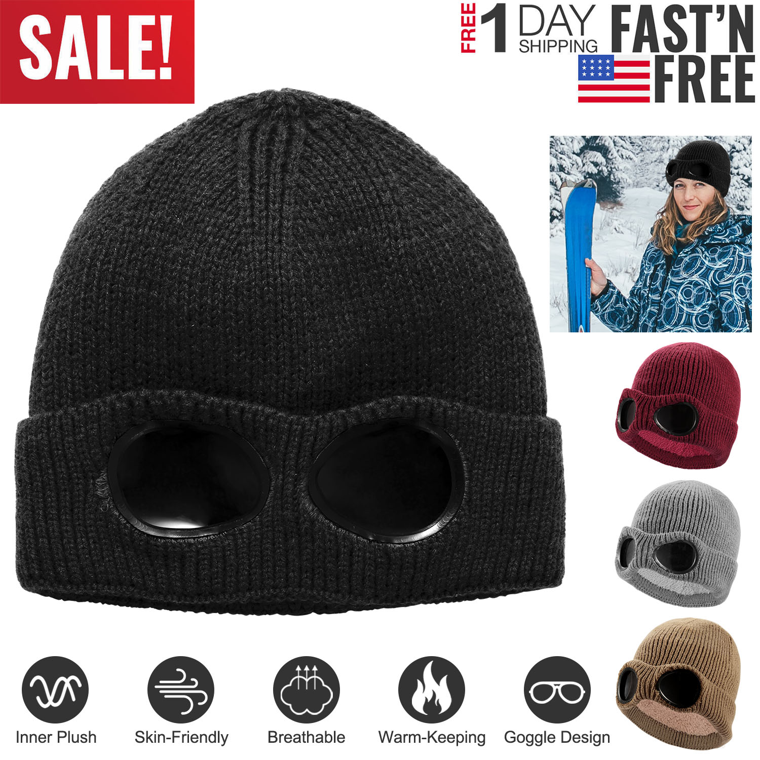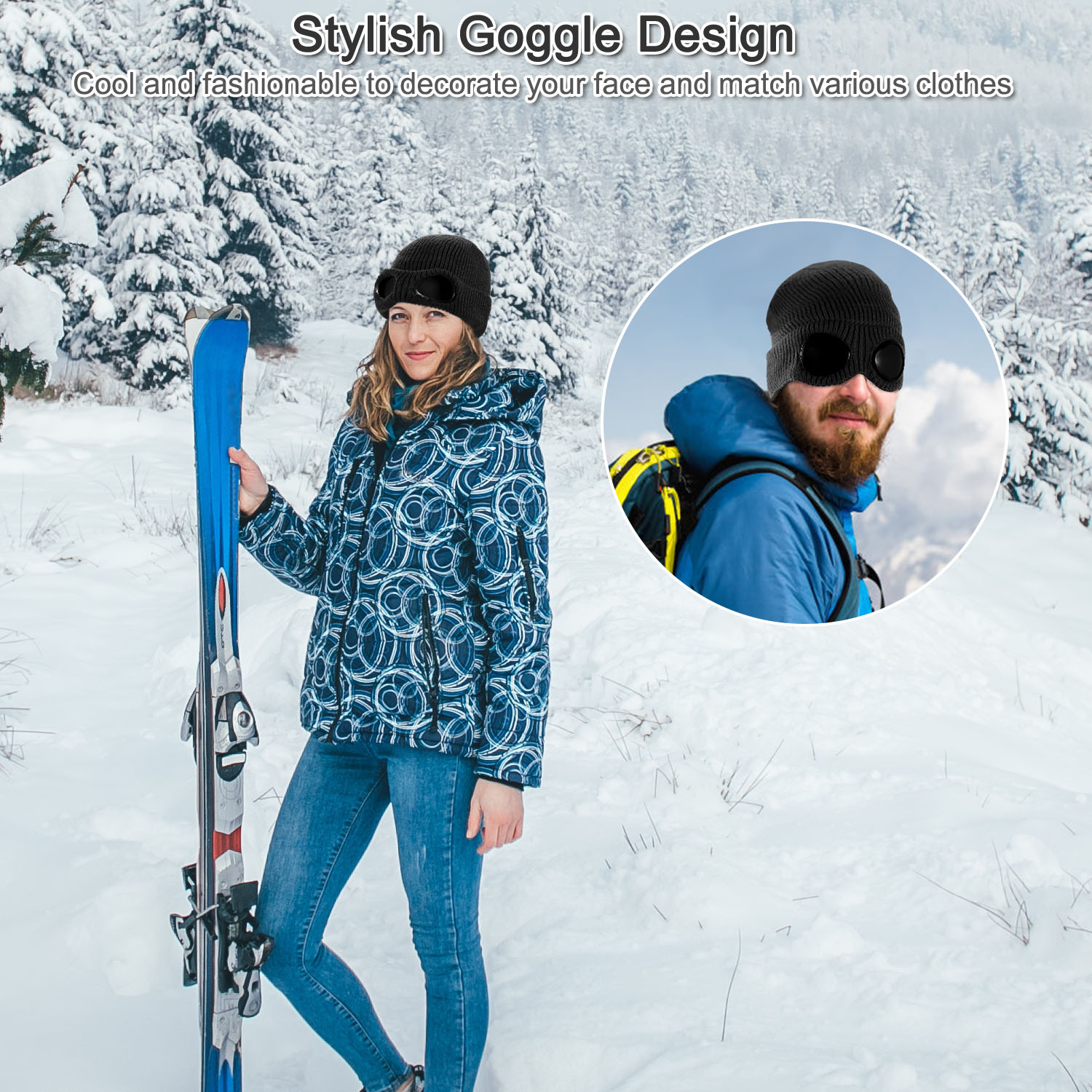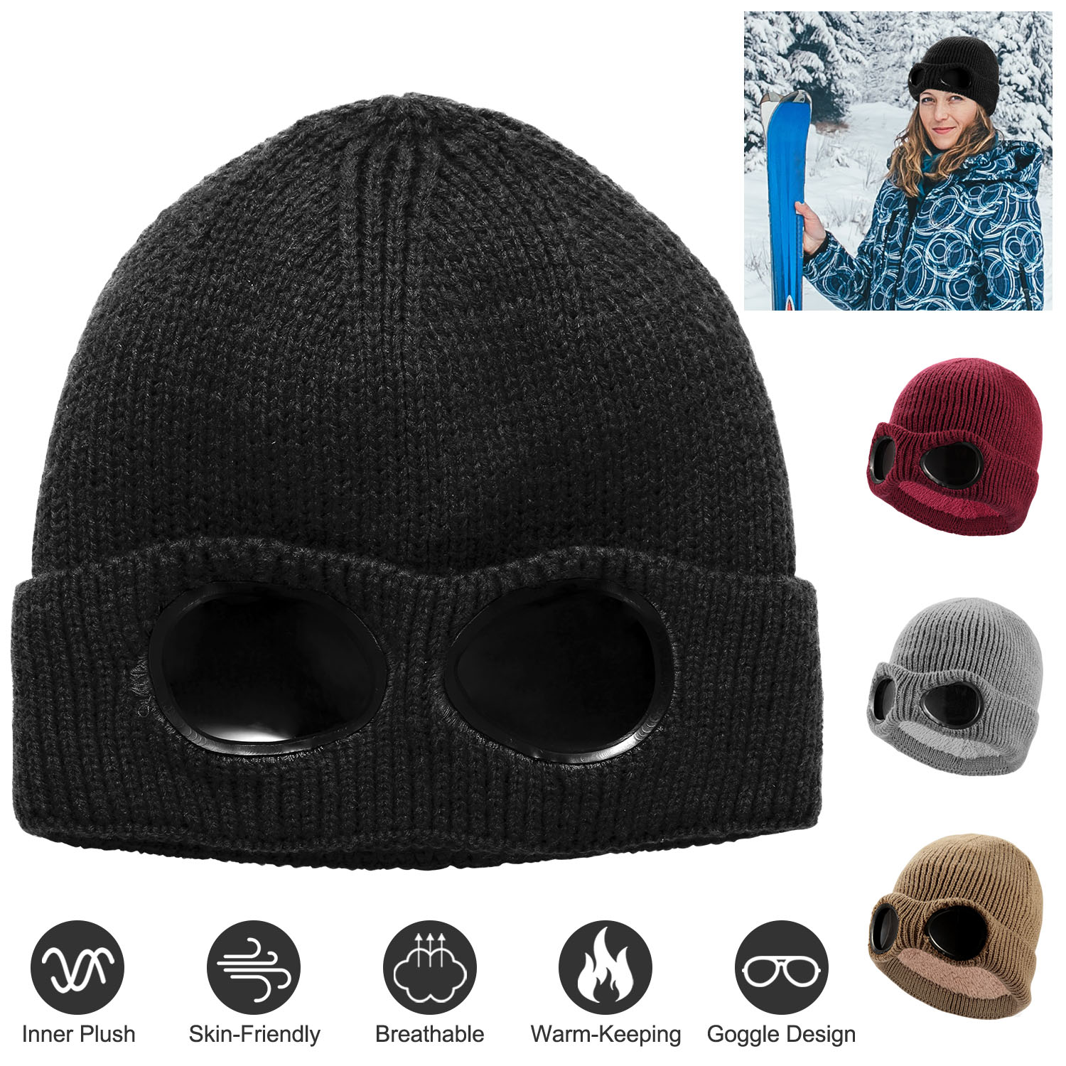 Unisex Knit Beanie Hat with Goggle Chunky Winter Warm Hat Skull Cap 4 Colors